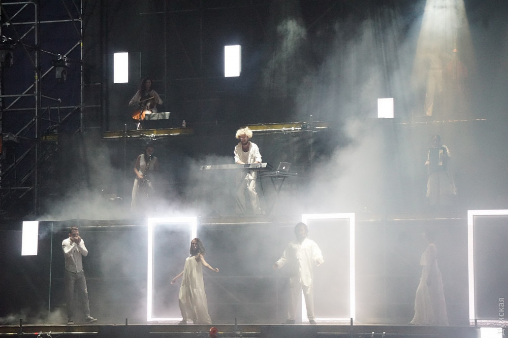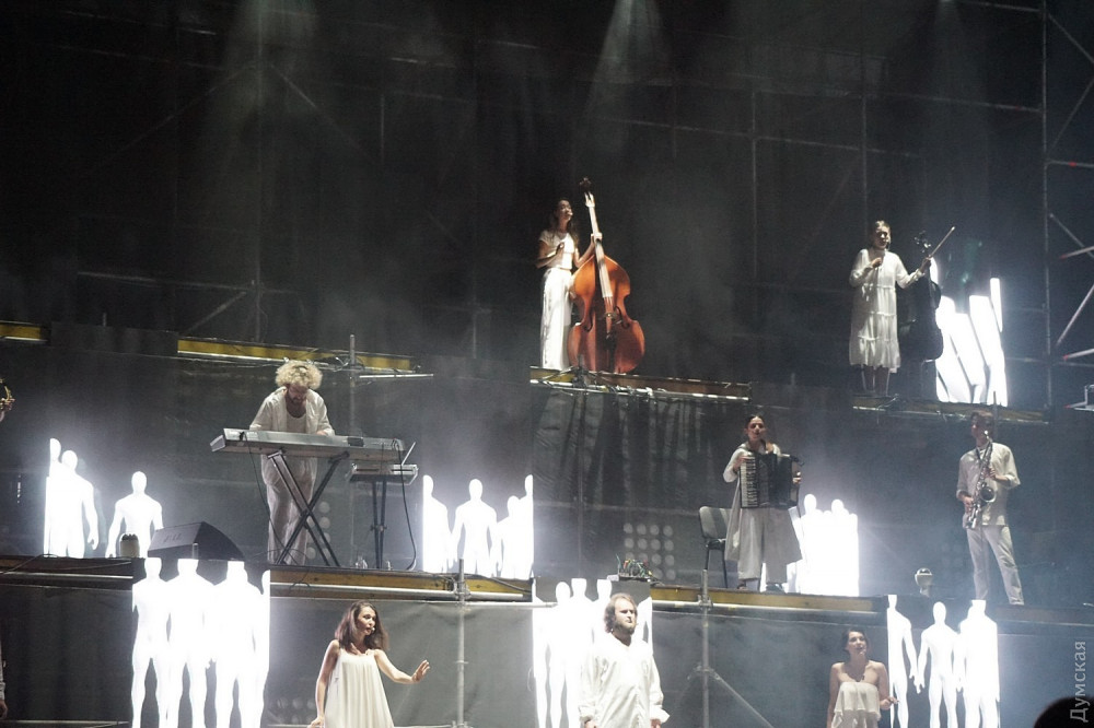Завершился день перформансом Влада Троицкого на Потемкинской лестнице. Поучительные тексты, грандиозные эффекты и живая музыка – да это снимать надо отдельным фильмом!