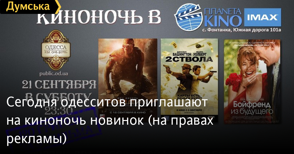Киноночь новинок пройдет сегодня, 20 сентября, в кинотеатре «Планета Кино», что в Фонтанке Коминтерновского района. Мероприятие проводится пабликом «Одесса как она есть». Как сообщают организаторы, зрители увидят фильмы «Риддик», «Два ствола» и «Бойфренд из будущего». Цена билета составляет 120 гривен. Начало киноночи –в 23:30 в ТРЦ «Ривьера» . Забронировать билеты можно здесь. СМЕРТЬ РОССИЙСКИМ ОККУПАНТАМ! Заметили ошибку? Выделяйте слова с ошибкой и нажимайте control-enter |