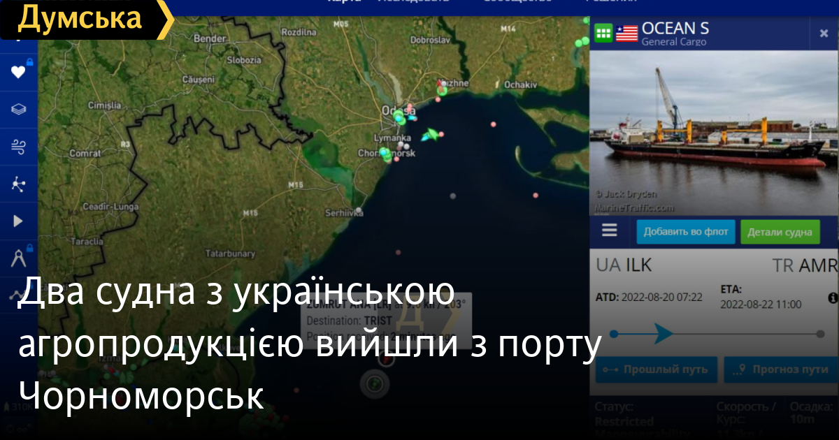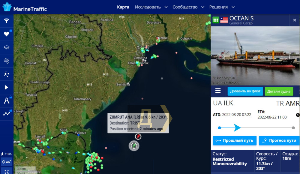 Балкер OCEAN S та танкер ZUMRUT ANA, завантажені українською агропродукцією, вийшли вранці 20 серпня з порту Чорноморськ. Обидва судна під ліберійським прапором прямують до Туреччини. OCEAN S йде до турецького порту Амбарлі, а ZUMRUT ANA - до Стамбула.