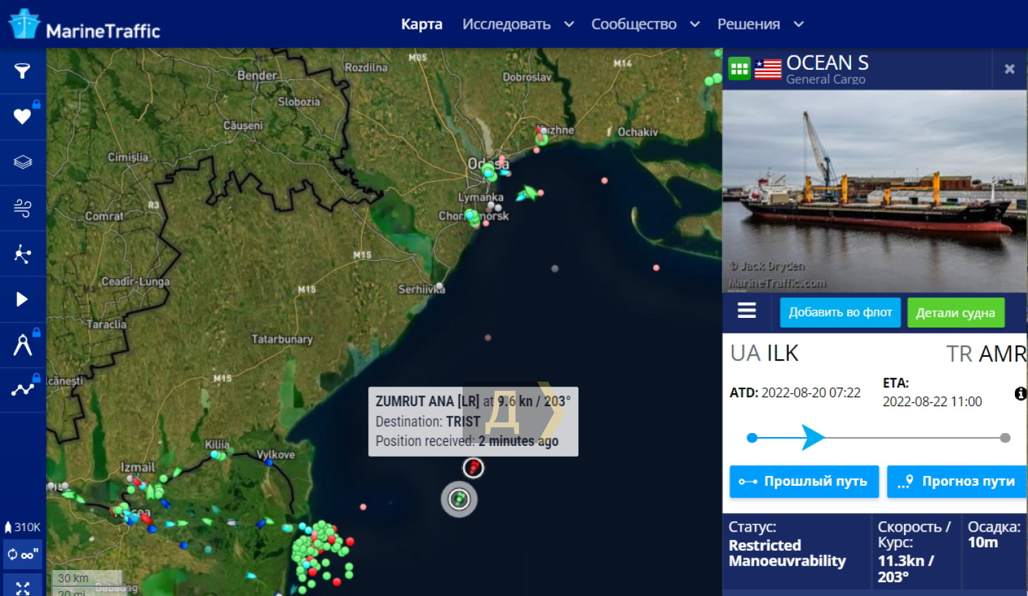 Балкер OCEAN S та танкер ZUMRUT ANA, завантажені українською агропродукцією, вийшли вранці 20 серпня з порту Чорноморськ. Обидва судна під ліберійським прапором прямують до Туреччини. OCEAN S йде до турецького порту Амбарлі, а ZUMRUT ANA - до Стамбула.