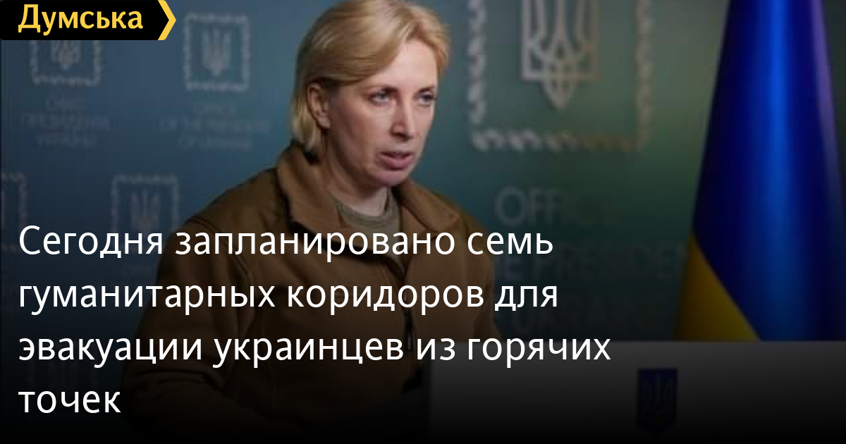 Семь гуманитарных коридоров планируют открыть 5 апреля для эвакуации украинцев из горячих точек, сообщает министр по вопросам реинтеграции временно оккупированных территорий Украины Ирина Верещук.