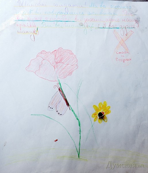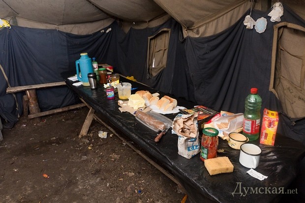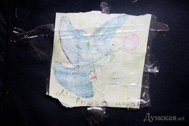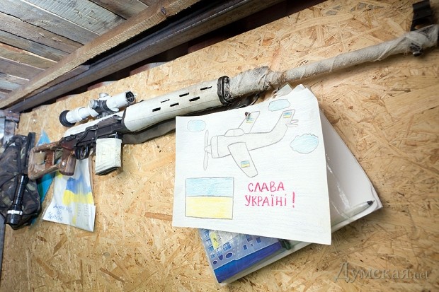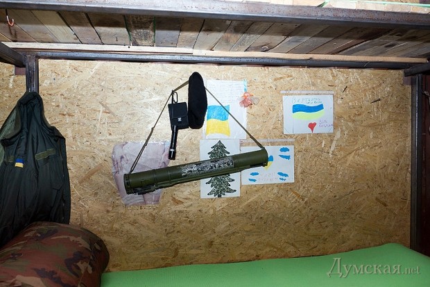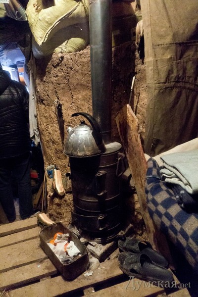Птичка ведет нас в свой блиндаж, укрытый маскировочной сеткой, которая связана руками одесситок. Двухкомнатный номер вырыт на двухметровой глубине в плодородной украинской земле. От сырости и холода спасают шерстяные одеяла, строительный утеплитель и постоянно работающая печь. Тусклый свет лампочки освещает нехитрый быт защитников Родины. На стене – флаг Украины, при входе в комнату сложено оружие, в углу — комок удлинителей и проводов заряжающихся девайсов, потолок украшен поделками и рисунками маленьких украинцев, которые желают воину вернуться домой во что бы то ни стало живым, здоровым и с победой.