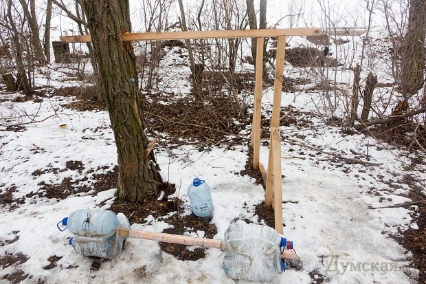 Блокпост — это комплекс блиндажей, соединенных окопами. Тут есть все необходимое для жизни: отдельные «номера», столовая, погреб с запасом провизии на несколько месяцев и даже тренажерный зал на открытом воздухе. Бойцы сколотили брусья, турник, сделали штангу, привязав с каждой стороны крепкой доски по три замерзшие баклажки воды. Пенек, обмотанный утеплителем, служит боксерской грушей. В общем, есть чем заняться в свободное время. Жаль только, что времени этого, по словам солдат, практически нет: