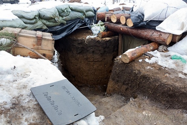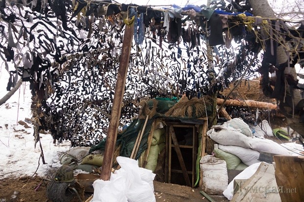 Мы съезжаем с дороги и через какое-то время прибываем к подземному городку, который который за три месяца среди иссеченных осколками акаций выкопали одесситы и их тернопольские побратимы. С полгода назад на этой территории стояли «ДНРовцы», от них даже остались окопы. Наши солдаты не пользуются ими принципиально, да и вырыты они, по словам Рупора, неграмотно.