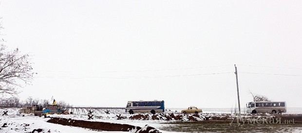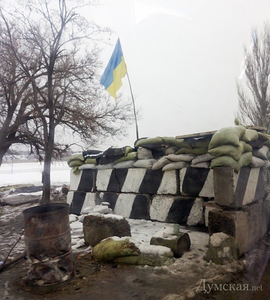 Пронзительный ветер развевает над блокпостом два флага – государственный и Тернополя. На фасадной стороне, обращенной к неприятелю, засевшему менее чем в двух километрах, красуется надпись «Одесса». Движение через КПП довольно оживленное. За те полчаса, что мы провели с бойцами, в сторону Мариуполя проехало пять автобусов и около 20 легковушек. Все автомобили тщательно проверяются пограничниками.