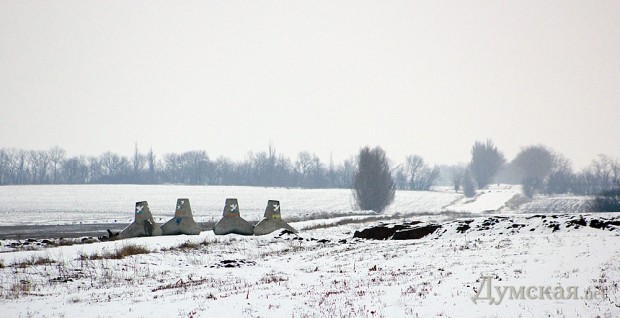 Приехали. На краю дачного поселка асфальтированную дорогу перерезают бетонные блоки. По обе стороны, насколько видит глаз, в заснеженные поля уходят расставленные через равные промежутки противотанковые ежи. Почему-то именно эти ежи - черные росчерки на белом ватмане поля, — а не оружие в руках бойцов и разрушенные крыши домов дачного поселка окончательно убеждают в серьезности обстановки. Мы на войне.