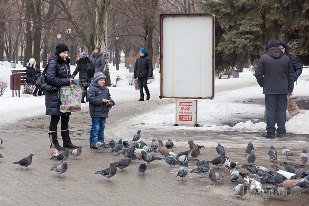 В целом Мариуполь производит впечатление спокойного города, живущего мирной и, можно сказать, размеренной жизнью. Несмотря на то, что практически в десяти километрах от него стоят войска неприятеля, а полевые укрепления можно легко рассмотреть из окон жилых высоток, на улицах прогуливаются молодые пары и мамочки с колясками, дети кормят голубей, а рестораны — посетителей. Работают магазины, школы, кафе и театры. Дымят трубы градообразующих предприятий, а местные любители рыбалки невозмутимо забрасывают удочки в Кальмиус. Единственное, что выдает реальное положение вещей – это большое количество военной техники, курсирующей по улицам, и хмурые люди с автоматами, которые нервно посматривают на прохожих, готовые ко всему. С экономикой, судя по всему, тоже не очень густо: о том, что бизнес-активность в Мариуполе едва теплится, говорит тот факт, что рекламные билборды либо пустуют, либо украшены обрывками предвыборной агитации, оставшейся с осени.