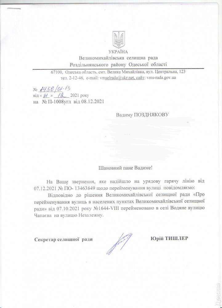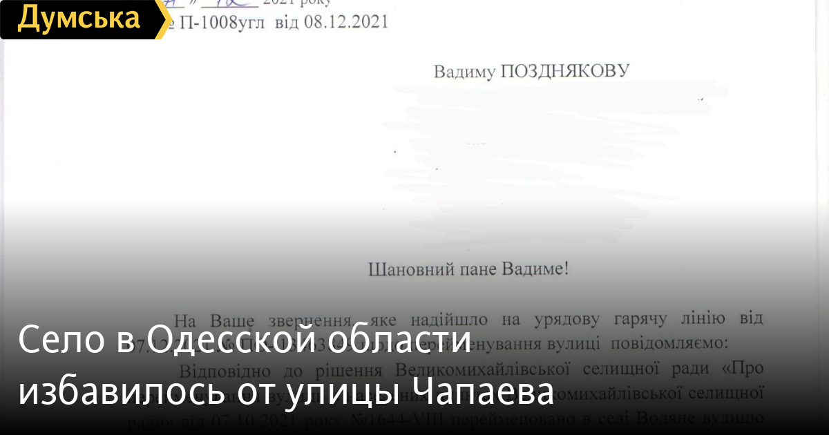 В селе Водяное Раздельнянского района переименовали улицу Чапаева. Теперь она стала Независимой.