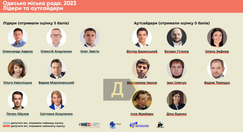 Що ж стосується персональних оцінок, то 2023 року в Одеській міськраді одразу семеро відмінників (роком раніше п'ятірку не отримав ніхто). Це керівник фракції «Українська мрія» Олександр Авдєєв (колишня ОПЗЖ), «слуги» Ольга Квасницька, Олексій Асауленко і Вадим Мороховський, представники «Євросолідарності» Олег Звягін і Петро Обухов, а також Світлана Осауленко з «Довіряй ділам».
