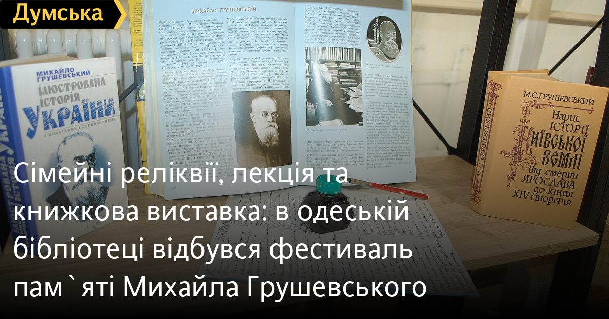 Сімейні реліквії, лекція та книжкова виставка: в одеській бібліотеці відбувся фестиваль пам`яті Михайла ГрушевськогоДві цікаві виставки відкрила Одеська обласна універсальна наукова бібліотека імені Михайла Грушевського в межах ХХVII обласного фестивалю «Безмежність української книги». Фестиваль присвячений пам’яті першого Президента Української народної республіки, творця української історіографії Михайла Грушевського, ім’я якого носить бібліотека. У вересні йому виповнилося б 157 років, а ще є важлива дата: 125-річчя виходу першого тому головної праці життя Грушевського «Історія України-Руси». Впродовж всього листопада в двох залах працюватимуть панельна виставка «Грушевськіана Львівського музею Михайла Грушевського» та книжкова «Михайло Грушевський: відомі та невідомі сторінки життя». Лекцію «(Не)знаний Михайло Грушевський» прочитала Софія Легін, вчений секретар Державного меморіального музею Михайла Грушевського у Львові. Пані Софія розповідала про самого Грушевського, його дружину Марію та донечку Кулюню (Катерину). А ще про побут галицької родини Грушевських, члени якої дбайливо зберегли та донесли до наших часів пам’ять та сімейні реліквії: оригінальні світлини, епістолярій, вишивки та багато іншого. Софія Легін подарувала львівські сувеніри, знамениту каву й солодощі директору Одеської бібліотеки Юліані Амельченко. Доктор історичних наук, професор Тарас Гончарук прочитав лекцію «Не просто Україна, а Україна-Русь. Як Михайло Грушевський захищає державні кордони». В рамках фестивалю також вiдбулися книжкова виставка до 160-річчя від дня народження Ольги Кобилянської, презентація біобібліографічного покажчика «Видатні державні та громадські діячі і правознавці України» та поетичні читання. Автор — Ірен Адлер, фото Володимира Андреєва Помітили помилку? Виділяйте слова з помилкою та натискайте control-enter Новини по цій темі: 2 листопада 2025: «Амінь, і поїхали»: одеситам показали портрети відьом та козака-характерника (фото) 22 вересня 2025: Артист не може бути поза політикою: Dakh Daughters в Одесі розповіли про відьом, важкі міста і в який час краще жити 19 вересня 2025: Йому довірять робити раму для Караваджо: одеситам показали виставку литовського музейника |