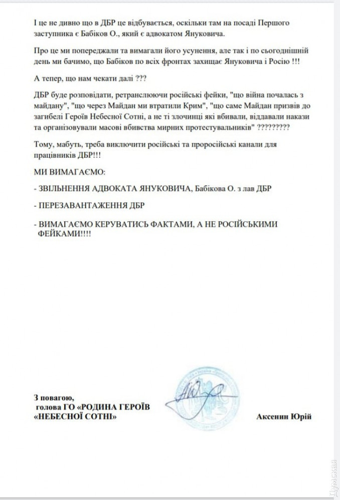 Семьи Героев Небесной Сотни требуют уволить заместителя директора ГБР Бабикова, который был адвокатом ЯнуковичаСемьи героев Небесной Сотни требуют уволить недавно назначенного первого заместителя директора ГБР Александра Бабикова. Об этом сообщила адвокат общественного объединения «Семьи Героев Небесной Сотни» Евгения Закревская. По ее словам, объединение подало соответствующее обращение на имя спикера парламента, президента и временно исполняющего обязанности главы ГБР. В своем обращении родные погибших героев Небесной Сотни утверждают, что Александр Бабиков является бывшим адвокатом Януковича, а само ГБР становиться ретранслятором российской пропаганды и фейков. «ГБР на сегодняшний день во время карантина и войны становится ретранслятором российской пропаганды и лжи, потому что фактически повторяет то, что транслирует Кремль. И не удивительно, что в ГБР это происходит, поскольку там в должности первого заместителя — Бабиков А., который является адвокатом Януковича. Об этом мы предупреждали и требовали его устранения, но так и по сегодняшний день мы видим, что Бабиков по всем фронтам защищает Януковича и Россию», — говорится в обращении. Как ранее сообщала «Думская», следователи ГБР сообщили Чорновол о подозрении в умышленном причинении смерти человека во время пожара в офисе «Партии регионов» в 2014 году. В свою очередь, на ее защиту выступил глава МВД Арсен Аваков и б ывший политзаключенный Олег Сенцов. СМЕРТЬ РОССИЙСКИМ ОККУПАНТАМ! Заметили ошибку? Выделяйте слова с ошибкой и нажимайте control-enter |
