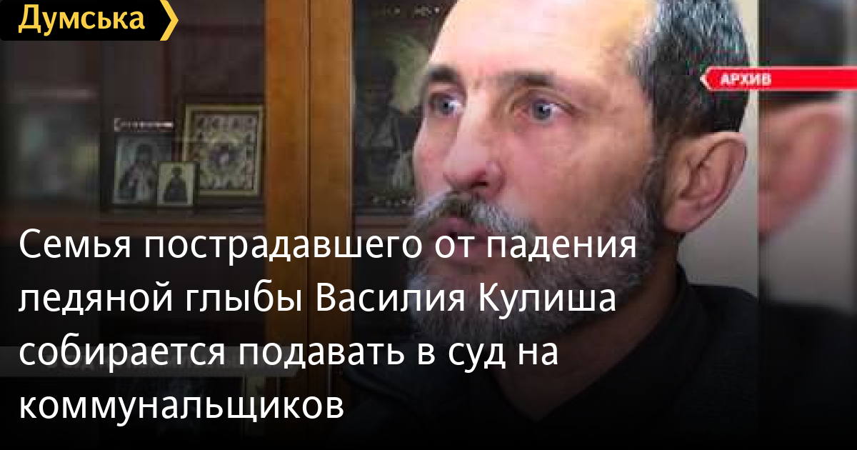 Семья пострадавшего от падения ледяной глыбы Василия Кулиша собирается подавать в суд на коммунальщиковСемья пострадавшего от падения ледяной глыбы Василия Кулиша собирается подавать в суд на коммунальщиков. Напомню, в конце января одессит попал в реанимацию с шестью сломанными ребрами, пробитым легким и травмой позвоночника. СМЕРТЬ РОССИЙСКИМ ОККУПАНТАМ! Заметили ошибку? Выделяйте слова с ошибкой и нажимайте control-enter Думская ТВ. Сюжеты: