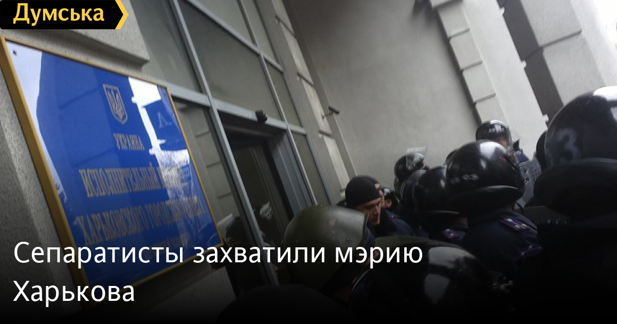 В Харькове люди с георгиевскими лентами, вооруженные битами, прорвались та территорию горсовета и заблокировали здание.