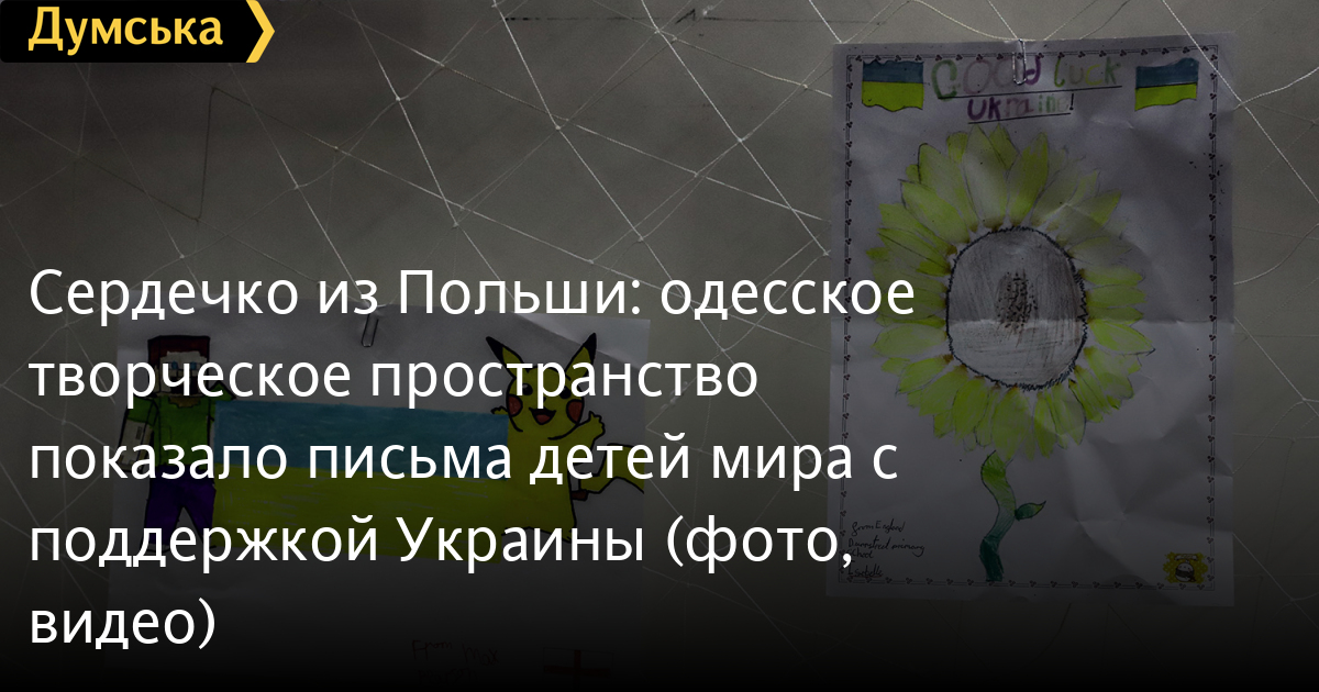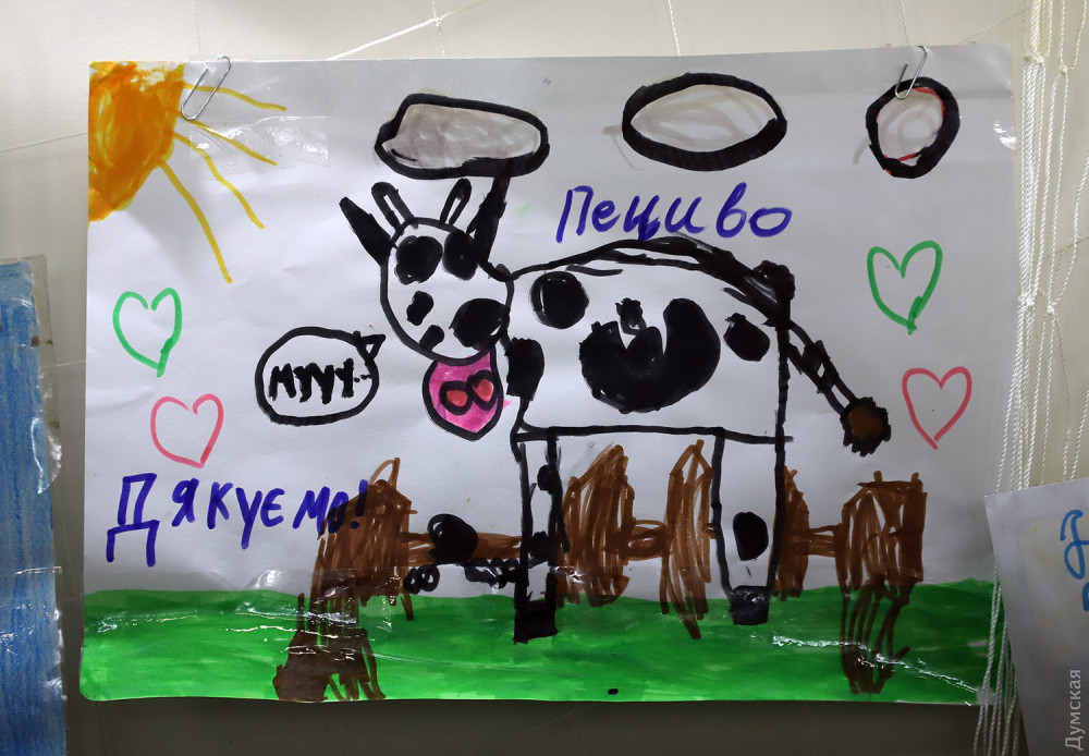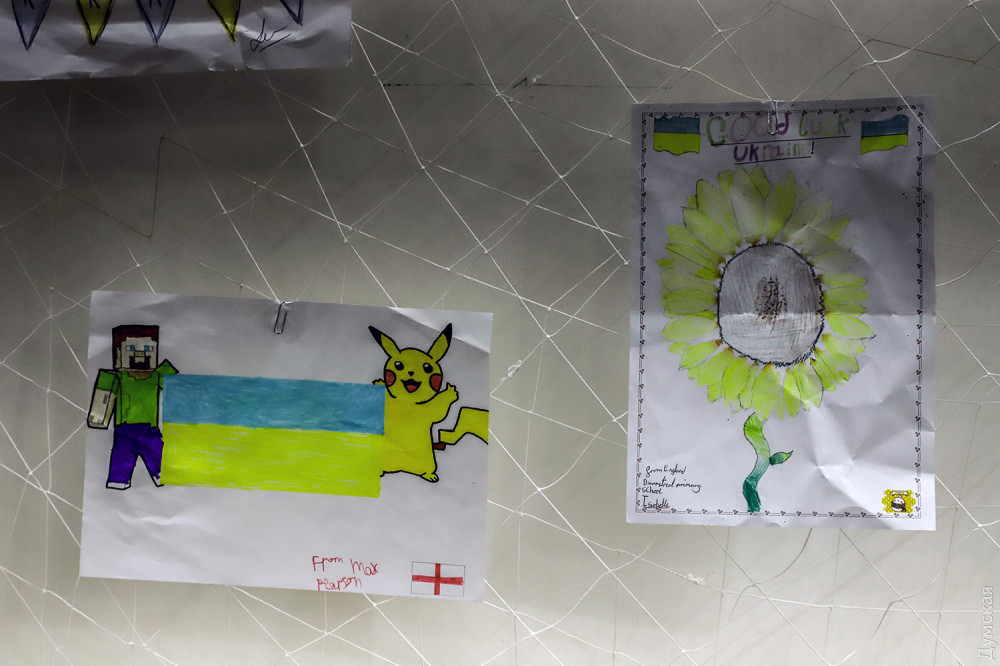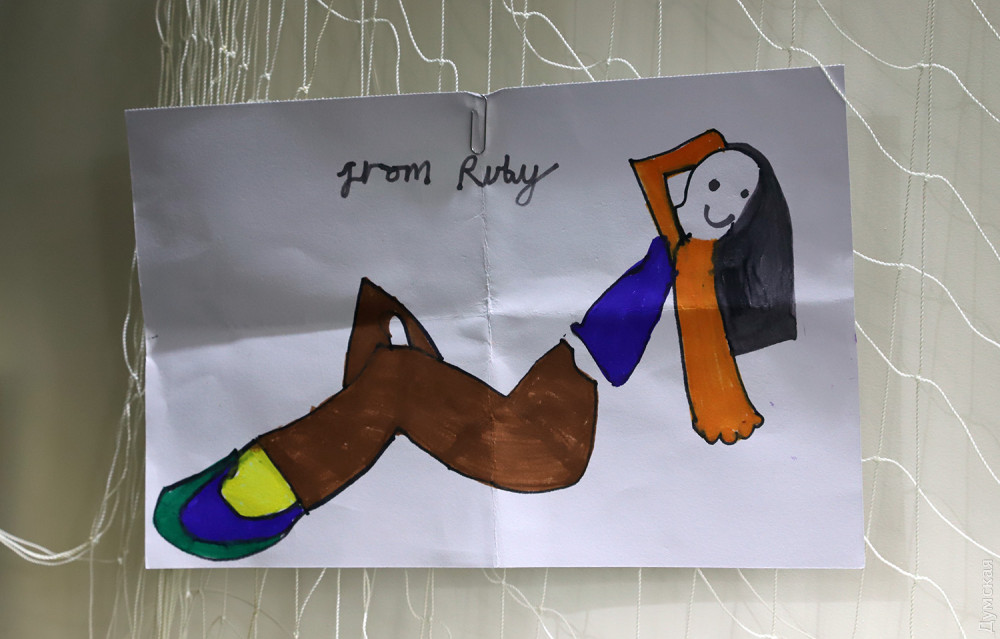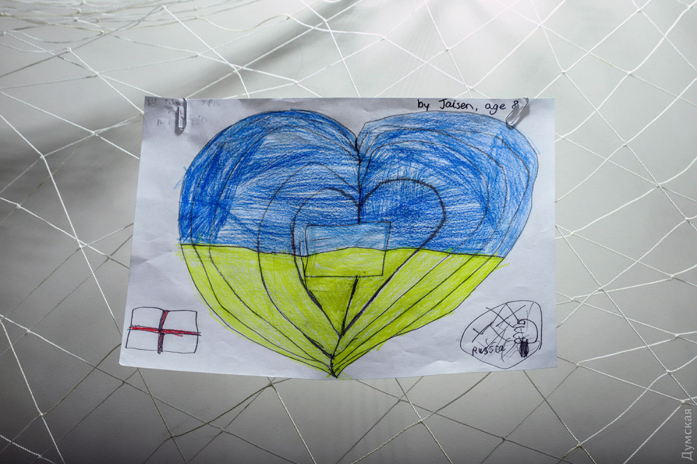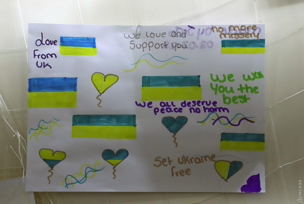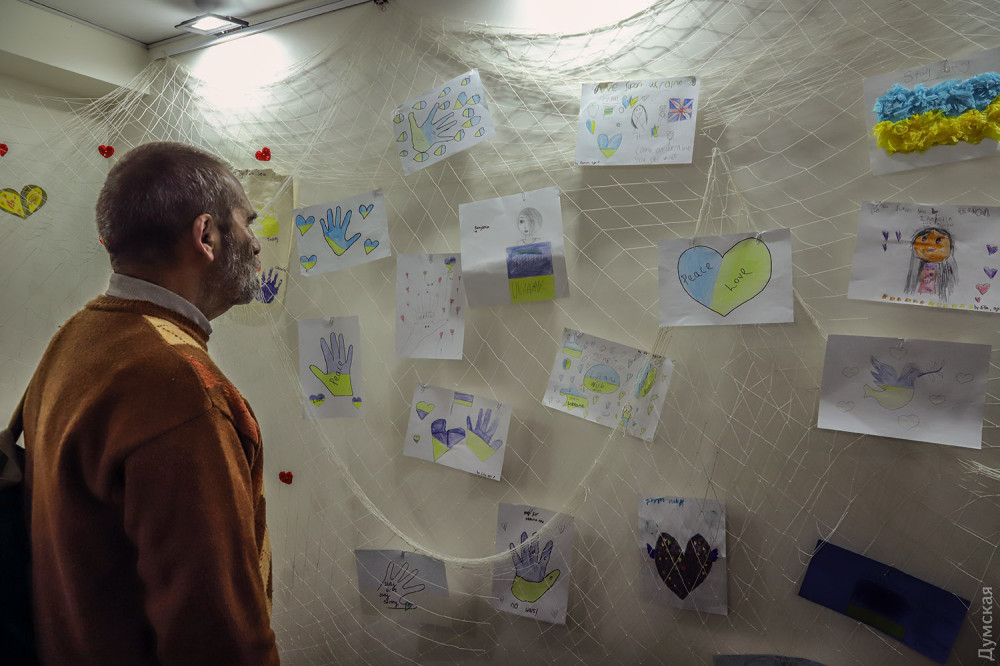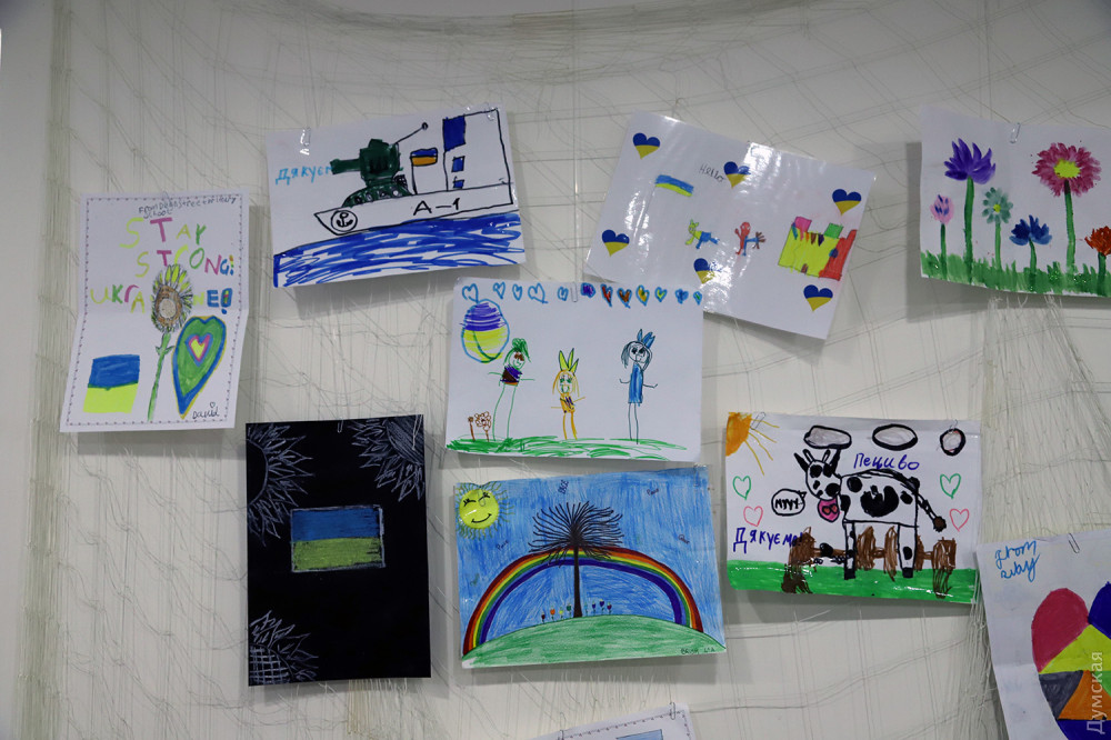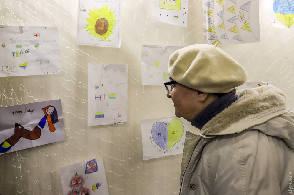 «Борис Тынка – гид, работает в Одессе, — представила польского гостя организатор выставки Юлия Сущенко. – Знакомит поляков с нашей страной и с нашим городом, возит их по маршруту «Дорога вина и вкуса». Когда началась война, он остался в Украине, стал организовывать гуманитарную помощь, и уже порядка двадцати автобусов привез вместе с Александром Бабичем. Получая посылки, их открывают, чтобы сортировать для разных получателей, и почти в каждой находят какие-то рисунки детские, открыточки, вязаные сердечки, которые туда люди вкладывают. Борис их фотографировал и выкладывал на Фейсбуке. Я увидела их, поинтересовалась, и узнала, что таких рисунков уже целая пачка. Мне передали эту пачку, я обзвонила своих друзей-волонтеров, которые занимаются гуманитарной помощью, они мне тоже передали рисунки, найденные в посылках. Тут собрано более 80-ти рисунков, количество писем и открыток я не считала».