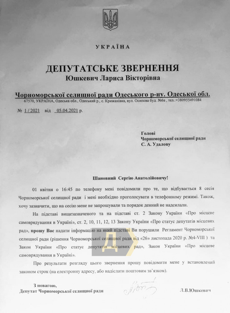 Необычную сессию провел 1 апреля местный совет пгт. Черноморское, что под Одессой. Несколько депутатов утверждают, что секретарь сельсовета Юлия Плешко провела внеочередное заседание в телефонном режиме.