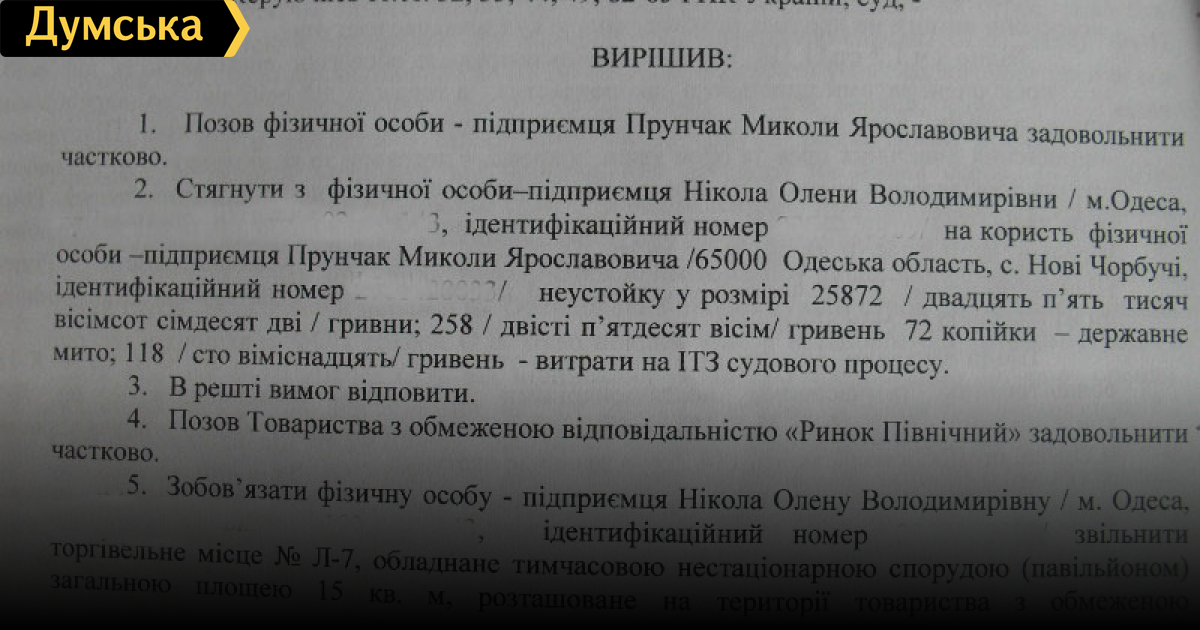 Обратите внимание на решение суда в пользу ООО «Рынок Северный». Оно в пользу Прунчак, жителя села Новые Чобручи. До начала конфликта все договоры предпринимателей-продавцов заключались не с администрацией, а с фиктивными предпринимателями с целью уклонения от налогообложения. ООО сдавало скопом не принадлежащие ему имущество, по 40 павильонов фиктивным, например Прунчаку, по цене 30 грн. за кв. метр, а Прунчак этим 40 продавцам сдавал по 224 грн. за метр. ООО показывало свои доходы в размере 30 грн за метр, реально получая по 224. Только за 2008 год народ посчитал неуплату налогов на сумму 4млн. грн.. И это только по данным от протестных. Прунчак, Хавер, Иганова, Карпова, Середюк, Сулимов, Чипкун, Шевченко показывали в год положенные до 500 тыс. грн. У всех этих «предпринимателей» указан основной вид деятельности -70.20.0 -сдача в аренду собственного недвижимого имущества. Ни у одного из них нет на рынке собственного недвижимого имущества. Все они прекратили «предпринимательскую деятельность» в сентябре-октябре 2009 г. Готовились «на срыв». Все они являются фигурантами уголовного дела, похороненного судами. Преступная схема стала основой для судебного решения в пользу преступной схемы. Но справедливости ради, апелляция (Балух) приняла законное решение: ООО не создало торговые места, не имело право сдавать в аренду, не является собственником рынка. Но «вышка» все отменила и положила народ. Кстати, решение в вышке принимал судья Могил, родственник одного из одесских нардепов. Догадайтесь, чей?