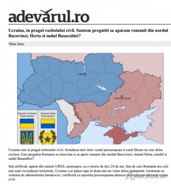 Влиятельный румынский ежедневник Аdevarul («ПРавда») призвал власти страны «защитить соотечественников, проживающих на территории Украины» и оккупировать «бывшие румынские территории» — Северную Буковину, Герцевский округ и Южную Бессарабию.
