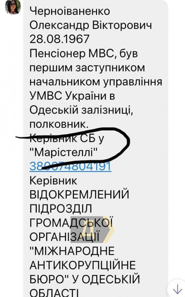 «Заявление в сессионном зале зачитывал депутат от Партии Шария Александр Черноиваненко — полковник МВД, активный участник пропагандистских шоу на пророссийских каналах и, если верить его тега м в Getcontact, руководитель службы безопасности в отеле Maristella, которым, на секундочку, владеет семья Юрия Крука, того самого, который председатель Одесской РГА», — говорит она.