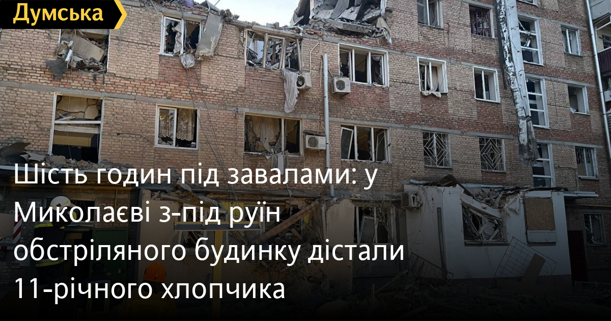 11-річного хлопчика дістали з-під завалів зруйнованого п'ятиповерхового будинку у Миколаєві, в який вночі влучила ворожа ракета. Пошуки ще семи людей продовжуються.