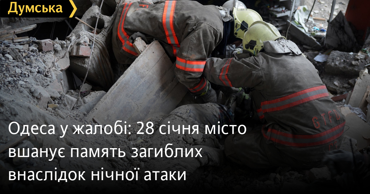 Одеса у жалобі: 28 січня місто вшанує пам’ять загиблих внаслідок нічної атакиДнем жалоби оголосили 28 січня в Одесі через загибель трьох людей внаслідок ворожої масованої атаки на місто минулої ночі. У цей день на будівлях буде приспущено Державний Прапор України та прапор Одеси з траурними стрічками, повідомили у мерії. Підприємствам, установам і організаціям міста незалежно від форми власності рекомендовано обмежити використання музики та проведення розважальних заходів. Нагадаємо, усього в результаті дронової атаки постраждали 23 людини, 9 - госпіталізовані, серед них 2 дитини (дівчатка 2013 і 2008 року народження) і вагітна жінка. Одна людина перебуває у важкому стані, ще вісім — у стані середньої тяжкості. З-під завалів дістали тіла трьох осіб. Рятувально-пошукова операція завершилася близько 15:00. Від ДСНС залучалися 18 одиниць техніки та 94 рятувальники. За інформацією мерії, в Приморському районі пошкоджено 43 будинки та, за попередніми даними, 122 квартири. У Пересипському районі постраждали три будинки, вибито понад 200 вікон, з яких 51 конструкція повністю знищена вогнем. Крім того, сильно постраждали навчальні заклади Одеси. Як повідомив глава ОВА Олег Кіпер, серед них «Ясла-садок» №14. Вибуховою хвилею в приміщенні вибиті вікна, пошкоджені міжкімнатні двері. «Найбільших руйнувань знову зазнала Одеська професійна школа будівництва та архітектури. Заклад тільки нещодавно постраждав в результаті чергової ворожої атаки безпілотниками — тоді було знищено понад 200 вікон і пошкоджено окремі навчальні лабораторії, — зазначив Кіпер. — Цієї ночі ворог знову підступно атакував школу. Один з кращих профтехів міста та області отримав істотні пошкодження. У будівлі виникла пожежа, яку оперативно ліквідували». Ліквідація наслідків атаки триває. Комунальні служби продовжують розбирати завали, розчищати проїзди. Вже вивезено 380 м³ уламків. На місцях розгорнуті оперативні штаби. Профільні служби фіксують наслідки обстрілу й оцінюють масштаби збитків. СМЕРТЬ РОСІЙСЬКИМ ОКУПАНТАМ! Помітили помилку? Виділяйте слова з помилкою та натискайте control-enter