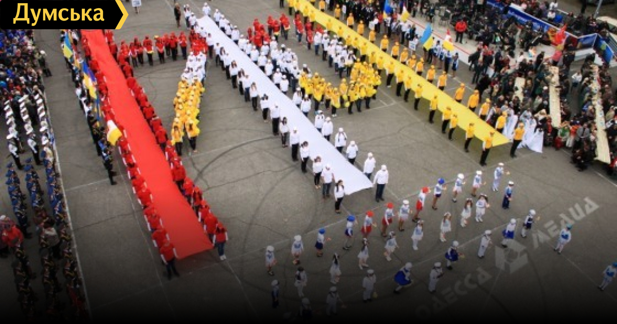 », приуроченного к 70-ой годовщине освобождения Одессы от немецко-фашистских захватчиков. Отметим, что в субботу в городе состоялись как минимум три флешмоба – до этого одесситы пели гимн в торговом центре и украшали ленточками цветов национального флага ограждение железнодорожного вокзала. Фото: «Одесса-медиа»