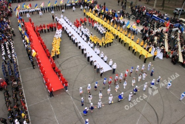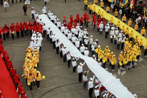 Около 300 школьников и 100 студентов выстроились в виде огромной цифры «70» цветов флага Одессы.