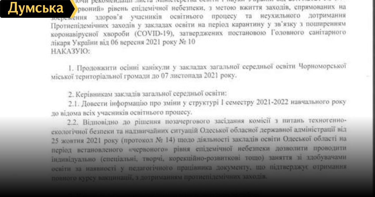 Школьные каникулы в Черноморске Одесской области продлили до 7 ноября.