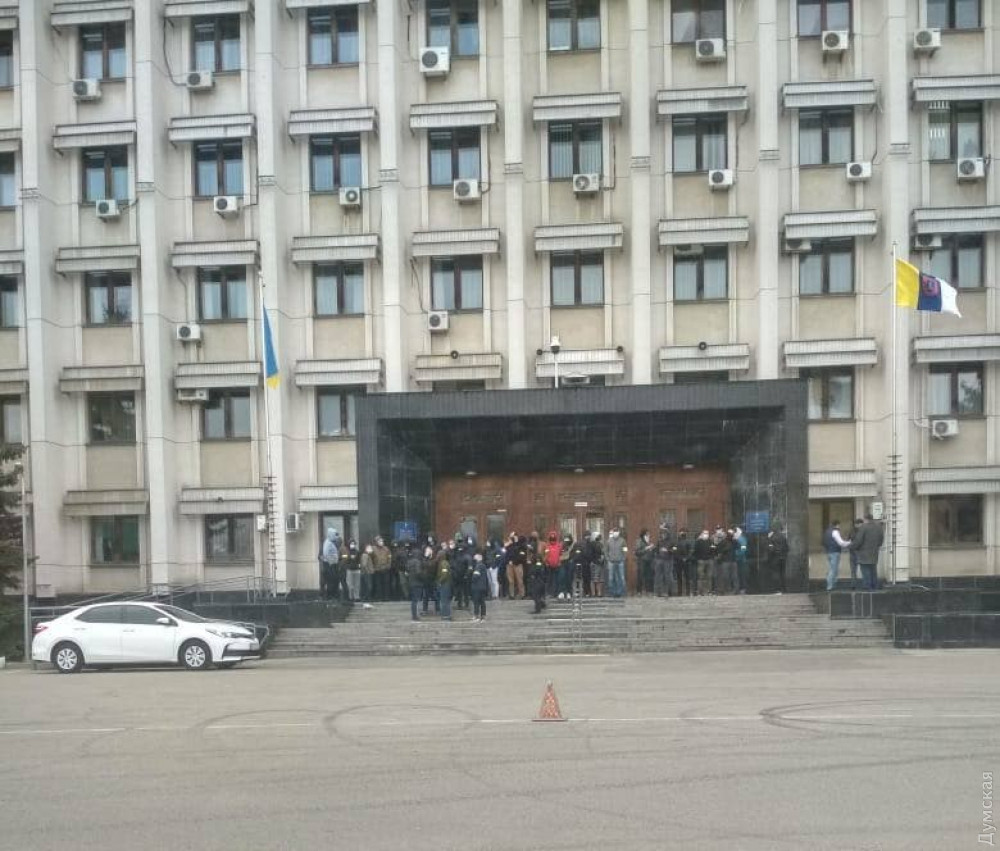 Группа крепких молодых людей с желтыми повязками, собравшаяся сегодня во второй половине дня у входа в Одесскую областную госадминистрацию, встревожила горожан.