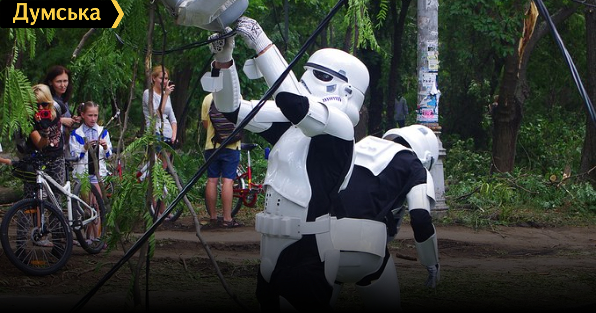По приказу Императора Галактики Палпатина имперские штурмовики приступили к оказанию помощи одесскому КП «Горсвет». Они убирают оборванные провода с тротуаров и дорог, а также восстанавливают систему уличного освещения.