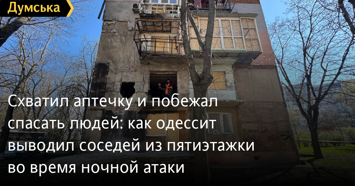 Схватил аптечку и побежал спасать людей: как одессит выводил соседей из пятиэтажки во время ночной атакиНочная атака дронов на Одессу в очередной раз показала сплоченность горожан. Один из жителей района, Константин, стал первым, кто оказал помощь пострадавшим в пятиэтажке на Черемушках. Он рассказал кореспонденту «Думской», что момента пролета дрона не слышал — проснулся уже от мощного взрыва, от которого затрясся дом и посыпались стекла. Выбежав на улицу, Костантин увидел пламя и сразу понял, что медлить нельзя. «У меня с собой была аптечка, два турникета — побежал спасать людей. Я забежал на второй этаж помог, там был мужичек. Вывел его во двор. А на третьем оказались лежачие дедушка с бабушкой. Их было очень сложно транспортировать. Сосед помог мне вынести дедушку, а бабушку мы в шестерых выносили на носилках вместе со скорой. А потом здесь стояла одна машина, там, где стоит микроавтобус, я помогал ей выехать», — рассказывает одессит. Напомним, в результате ночного налета в пятиэтажке в Хаджибейском районе пострадали трое. Два человека (86-летние мужчина и женщина) госпитализированы с острой реакцией на стресс. Еще один будет лечиться амбулаторно. Взрывной волной и осколками повреждено около 250 окон и 25 балконов. Еще четыре балкона разрушены полностью. Пострадали 6 легковых автомобилей. СМЕРТЬ РОССИЙСКИМ ОККУПАНТАМ! Заметили ошибку? Выделяйте слова с ошибкой и нажимайте control-enter |