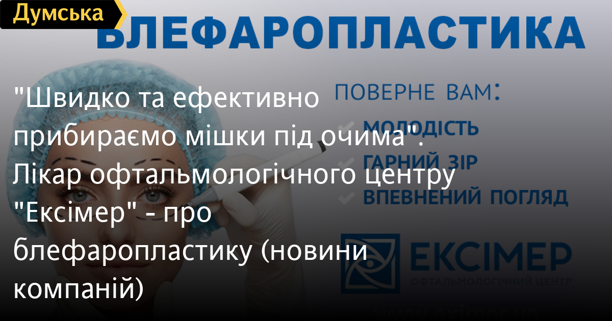 «Швидко та ефективно прибираємо мішки під очима». Лікар офтальмологічного центру «Ексімер» — про блефаропластику (новини компаній)Навіть найменші естетичні вади чи утворення в зоні очей дуже помітні й одразу привертають увагу, тому блефаропластика сьогодні є дуже популярною операцією – як у світі, так і в Україні. Про те, які проблеми може розв’язати ця операція, наскільки вона складна та до кого краще звертатися, розповідає професор, президент Асоціації фахівців з офтальмопластики й очного протезування (ASOEP), лікар вищої категорії офтальмологічного центру «Ексімер» Оксана Петренко.