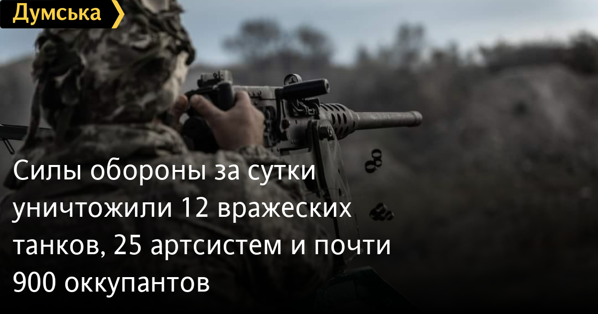 Сили оборони за добу знищили 12 ворожих танків, 25 артсистем та майже 900 окупантівМайже 900 солдатів і офіцерів, 12 танків, 25 артилерійських систем втратили російські загарбники минулої доби. За даними Генерального штабу Збройних сил України, наші захисники також знищили 22 бойові броньовані машини, 2 системи ППО, 6 дронів оперативно-тактичного рівня, крилату ракету, 15 одиниць автомобільної техніки та 7 - спецтехніки. Загальні бойові втрати противника з 24.02.22 по 23.10.23 орієнтовно становлять: особового складу ‒ 294700 (+870) осіб ліквідовано танків ‒ 5093 (+12) бойових броньованих машин ‒ 9653 (+22) артилерійських систем ‒ 7057 (+25) РСЗВ ‒ 825 (0) засоби ППО ‒ 551 (+2) літаків ‒ 320 (0) гелікоптерів ‒ 324 (0) БПЛА оперативно-тактичного рівня ‒ 5345 (+6) крилаті ракети ‒ 1536 (+1) кораблі / катери ‒ 20 (0) підводні човни ‒ 1 (0) автомобільної техніки та автоцистерн ‒ 9419 (+15) спеціальна техніка ‒ 998 (+7) СМЕРТЬ РОСІЙСЬКИМ ОКУПАНТАМ! Помітили помилку? Виділяйте слова з помилкою та натискайте control-enter |