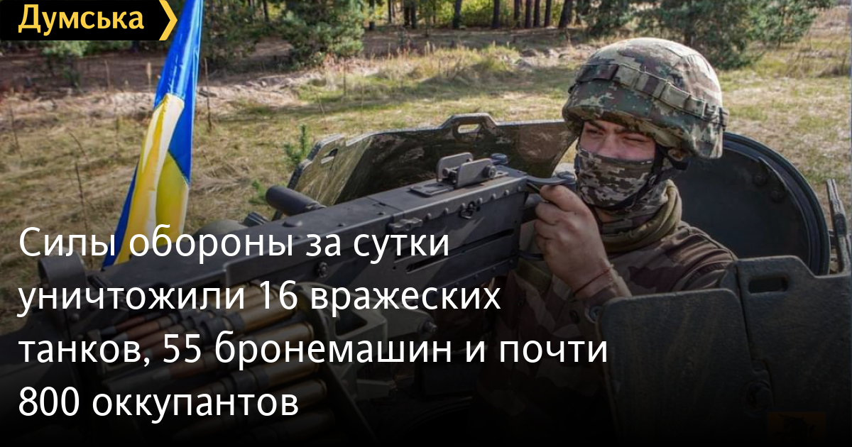 Почти 800 солдатов и офицеров, 16 танков и 55 боевых бронированных машин потеряли российские захватчики за прошедшие сутки.