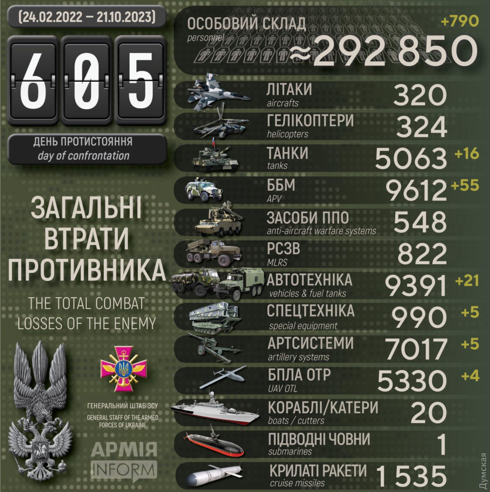 Общие боевые потери противника с 24.02.22 по 21.10.23 ориентировочно составляют: