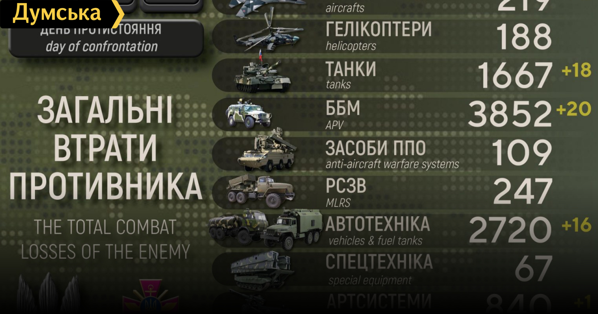 Сили оборони за добу знищили 18 танків, 20 бойових броньованих машин та артилерійську систему (інфографіка)18 танків, 20 бойових броньованих машин та артилерійську систему втратили загарбники минулої доби в Україні. Вбито або потрапило у полон 300 російських нацистів, повідомляють у Генштабі Збройних сил. Також українські захисники знищили три безпілотники оперативно-тактичного рівня та 16 одиниць автомобільної техніки. Загальні бойові втрати противника з 24.02 по 13.07 орієнтовно склали: особового складу ‒ близько 37 870 (+300) осіб ліквідовано, танків ‒ 1 667 (+18) од, бойових броньованих машин ‒ 3 852 (+20) од, артилерійських систем – 840 (+1) од, РСЗВ ‒ 247 (+0) од, засоби ППО ‒ 109 (+0) од, літаків – 219 (+2) од, гелікоптерів – 188 (+0) од, БПЛА оперативно-тактичного рівня ‒ 681 (+3), крилаті ракети ‒ 155 (+0), кораблі /катери ‒ 15 (+0) од, автомобільної техніки та автоцистерн ‒ 2 720 (+16) од, спеціальна техніка ‒ 67 (+0). Найбільших втрат противник зазнав на краматорському напрямку. Дані уточнюються. СМЕРТЬ РОСІЙСЬКИМ ОКУПАНТАМ! Помітили помилку? Виділяйте слова з помилкою та натискайте control-enter |