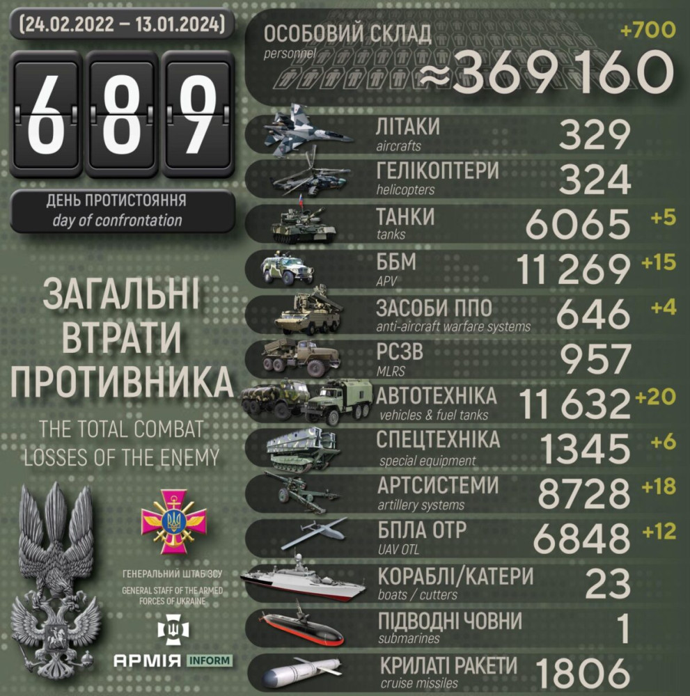 Силы обороны за сутки уничтожили 18 вражеских артсистем, 12 беспилотников и 700 оккупантов700 человек, пять танков и 18 артсистем потеряли российские оккупанты за прошедшие сутки. Кроме того, по данным Генерального штаба Вооруженных сил Украины, наши защитники также уничтожили 15 боевых бронированных машин, четыре средства ПВО, 12 БПЛА оперативно-тактического уровня, 20 единиц автомобильной техники и шесть единиц спецтехники. Всего с начала полномасштабного вторжения потери врага составили: личного состава — 369 160 человек; танков — 6065 единиц; боевых бронированных машин — 11269 единиц; артиллерийских систем — 8728 единиц; РСЗО — 957 единиц; средства ПВО - 646 единиц; самолетов — 329 единиц; вертолетов — 324 единицы; БПЛА оперативно-тактического уровня — 6848; крылатые ракеты — 1806; корабли /катера — 23 единицы; подводные лодки — 1 единицу; автомобильной техники и автоцистерн — 11632 единицы; специальная техника — 1345. СМЕРТЬ РОСІЙСЬКИМ ОКУПАНТАМ! Помітили помилку? Виділяйте слова з помилкою та натискайте control-enter |