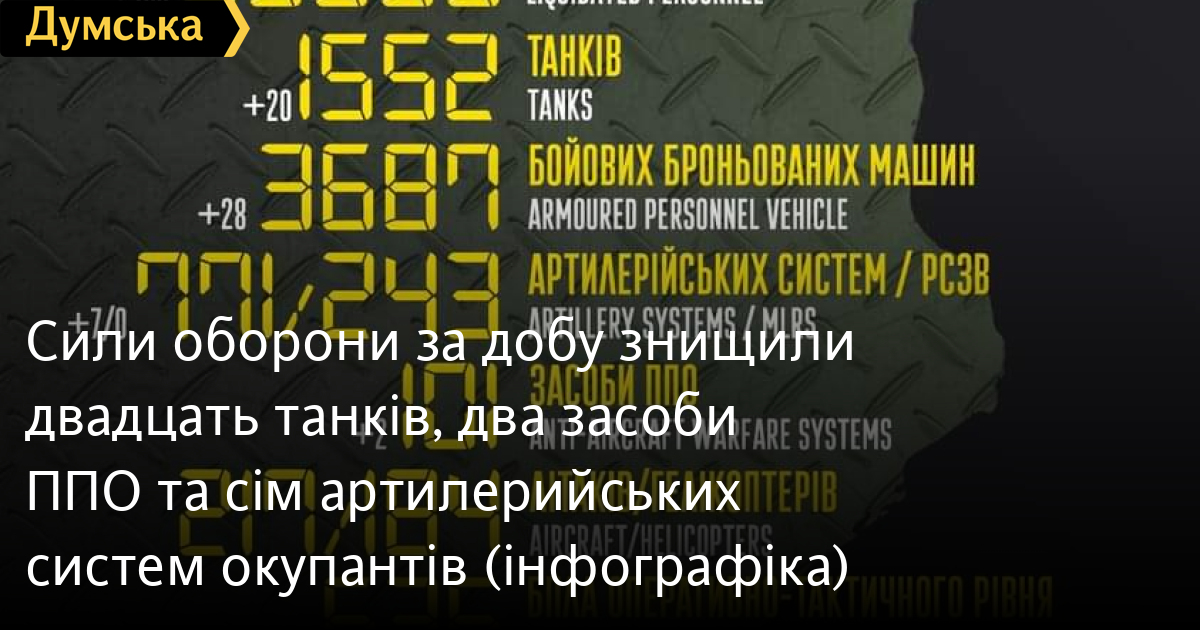 Двадцать танків, два засоби ППО та сім артилерійських систем втратили окупанти минулої доби в Україні.