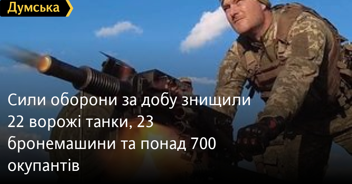 Сили оборони за добу знищили 22 ворожі танки, 23 бронемашини та понад 700 окупантівПонад 700 солдатів і офіцерів, 22 танки та 23 бойові броньовані машини втратили російські загарбники минулої доби. За даними Генерального штабу Збройних сил України, наші захисники також знищили 18 артилерійських систем, 2 засоби ППО, 9 дронів оперативно-тактичного рівня, 3 крилаті ракети та 11 одиниць автомобільної техніки. Загальні бойові втрати противника з 24.02.22 по 28.10.23 орієнтовно становлять: особового складу ‒ 298420 (+740) осіб ліквідовано танків ‒ 5167 (+22) бойових броньованих машин ‒ 9749 (+23) артилерійських систем ‒ 7180 (+18) РСЗВ ‒ 834 (0) засоби ППО ‒ 558 (+2) літаків ‒ 320 (0) гелікоптерів ‒ 324 (0) БПЛА оперативно-тактичного рівня ‒ 5399 (+9) крилаті ракети ‒ 1541 (+3) кораблі / катери ‒ 20 (0) підводні човни ‒ 1 (0) автомобільної техніки та автоцистерн ‒ 9524 (+11) спеціальна техніка ‒ 1011 (0) СМЕРТЬ РОСІЙСЬКИМ ОКУПАНТАМ! Помітили помилку? Виділяйте слова з помилкою та натискайте control-enter |