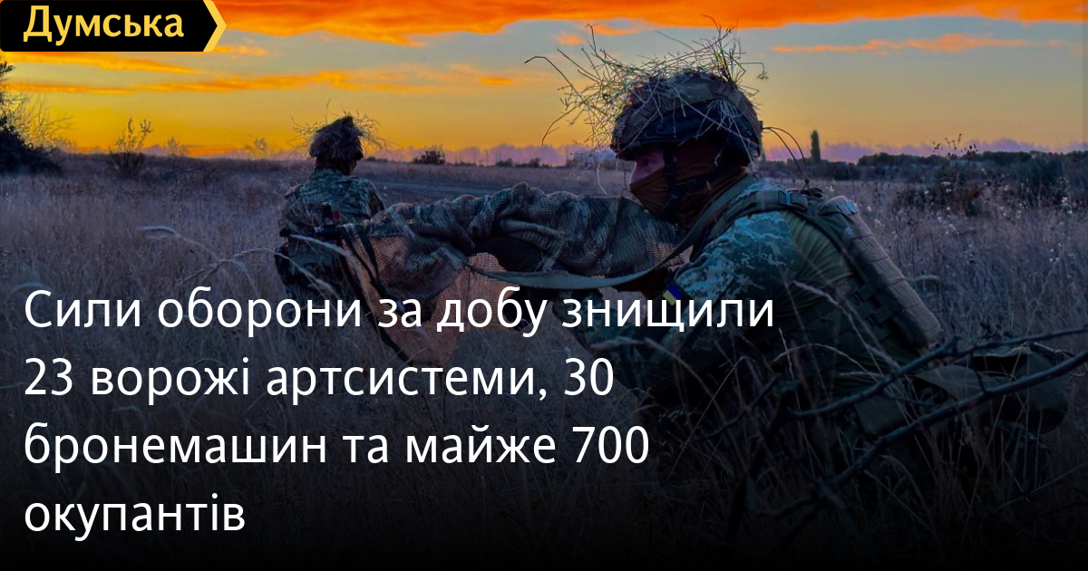 Сили оборони за добу знищили 23 ворожі артсистеми, 30 бронемашин та майже 700 окупантівМайже 700 солдатів і офіцерів, 23 артилерійські системи та 30 бойових броньованих машин втратили російські загарбники минулої доби. За даними Генерального штабу Збройних сил України, наші захисники також знищили 12 танків, 2 РСЗВ, засіб ППО, літак, 28 дронів оперативно-тактичного рівня, крилату ракету, 34 одиниці автомобільної техніки та 3 - спецтехніки. Загальні бойові втрати противника з 24.02.22 по 01.11.23 орієнтовно становлять: особового складу ‒ 301490 (+680) осіб ліквідовано танків ‒ 5223 (+12) бойових броньованих машин ‒ 9834 (+30) артилерійських систем ‒ 7250 (+23) РСЗВ ‒ 846 (+2) засоби ППО ‒ 563 (+1) літаків ‒ 321 (0) гелікоптерів ‒ 324 (0) БПЛА оперативно-тактичного рівня ‒ 5468 (+28) крилаті ракети ‒ 1547 (+1) кораблі / катери ‒ 20 (0) підводні човни ‒ 1 (0) автомобільної техніки та автоцистерн ‒ 9624 (+34) спеціальна техніка ‒ 1019 (+3) СМЕРТЬ РОСІЙСЬКИМ ОКУПАНТАМ! Помітили помилку? Виділяйте слова з помилкою та натискайте control-enter |