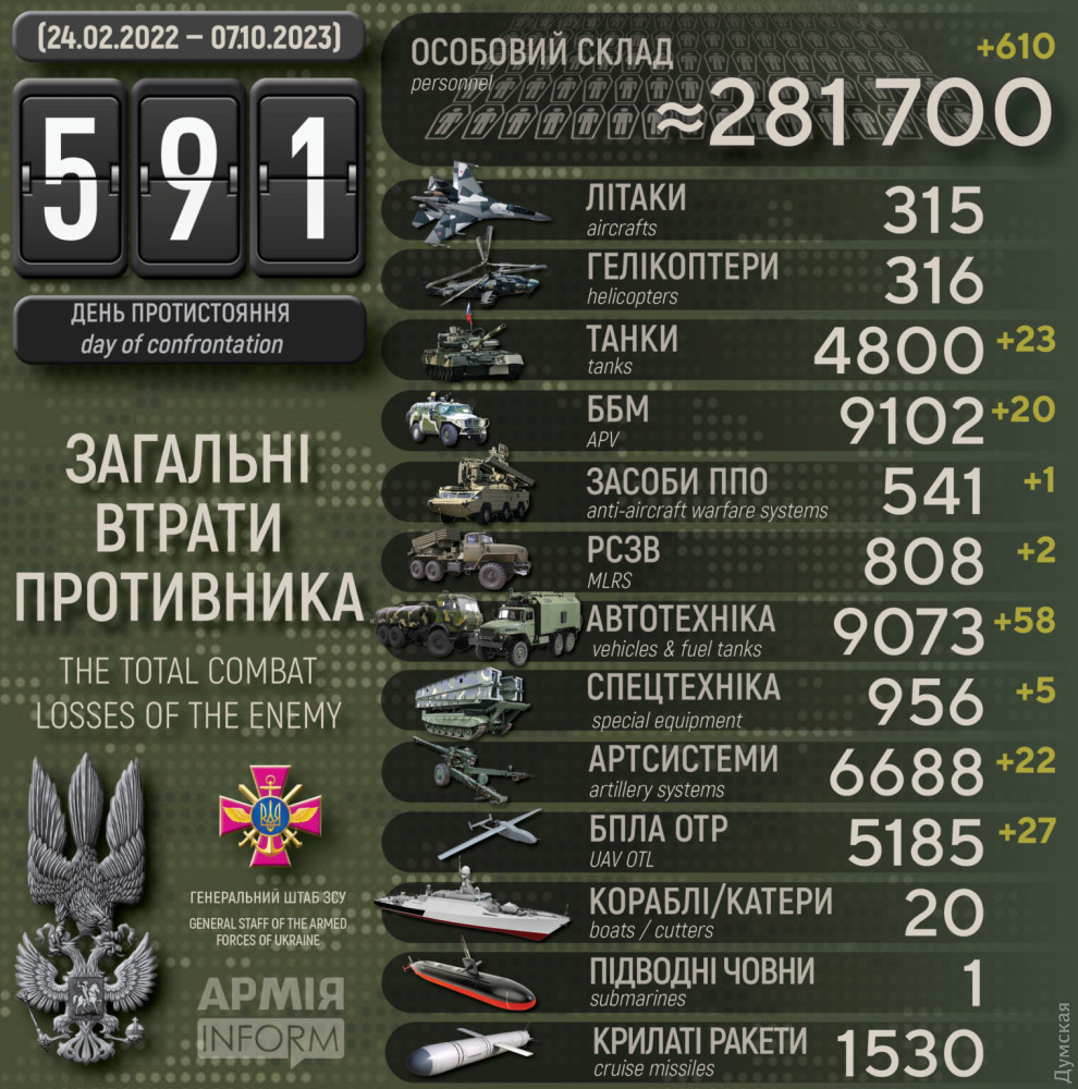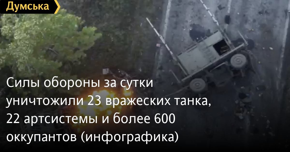 Силы обороны за сутки уничтожили 23 вражеских танка, 22 артсистемы и более 600 оккупантов (инфографика)Более 600 оккупантов, 23 танка и 22 артиллерийские системы потеряли российские захватчики за прошедшие сутки. По данным Генерального штаба Вооруженных сил Украины, наши защитники уничтожили также 20 боевых бронированных машин, 2 реактивные системы залпового огня, средство ПВО, 27 дронов оперативно-тактического уровня, 58 единиц автомобильной техники и 5 - спецтехники. Общие боевые потери противника с 24.02.22 по 07.10.23 ориентировочно составляют: личного состава — 281700 (+610) человек ликвидировано танков — 4800 (+23) боевых бронированных машин — 9102 (+20) артиллерийских систем — 6688 (+22) РСЗО — 808 (+2) средства ПВО - 541 (+1) самолетов — 315 (0) вертолетов — 316 (0) БПЛА оперативно-тактического уровня — 5185 (+27) крылатые ракеты — 1530 (0) корабли/катера — 20 (0) подводные лодки — 1 (0) автомобильной техники и автоцистерн — 9073 (+58) специальная техника — 956 (+5) СМЕРТЬ РОССИЙСКИМ ОККУПАНТАМ! Заметили ошибку? Выделяйте слова с ошибкой и нажимайте control-enter |