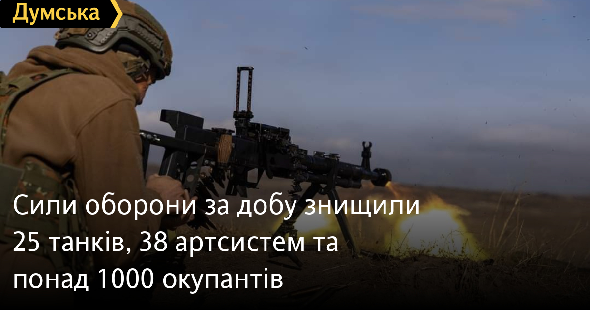 Сили оборони за добу знищили 25 танків, 38 артсистем та понад 1000 окупантівПонад 1100 солдатів і офіцерів, 25 танків та 38 артилерійських систем втратили російські загарбники минулої доби. За даними Генерального штабу Збройних сил України, наші захисники також знищили 24 бойові броньовані машини, 2 РСЗВ, засіб ППО, 25 дронів оперативно-тактичного рівня, крилату ракету, 49 одиниць автомобільної техніки та 9 - спецтехніки. Загальні бойові втрати противника з 24.02.22 по 11.11.23 орієнтовно склали / The total combat losses of the enemy from 24.02.22 to 11.11.23 were approximately: особового складу ‒ близько 310650 (+1130) осіб, танків ‒ 5342 (+25) од, бойових броньованих машин ‒ 10041 (+24) од, артилерійських систем – 7527 (+38) од, РСЗВ – 879 (+2) од, засоби ППО ‒ 579 (+1) од, літаків – 322 (+0) од, гелікоптерів– 324 (+0) од, БПЛА оперативно-тактичного рівня – 5620 (+25), крилаті ракети ‒ 1559 (+1), кораблі /катери ‒ 22 (+2) од, підводні човни — 1 (+0) од, автомобільної техніки та автоцистерн – 9925 (+49) од, спеціальна техніка ‒ 1069 (+9) СМЕРТЬ РОСІЙСЬКИМ ОКУПАНТАМ! Помітили помилку? Виділяйте слова з помилкою та натискайте control-enter |