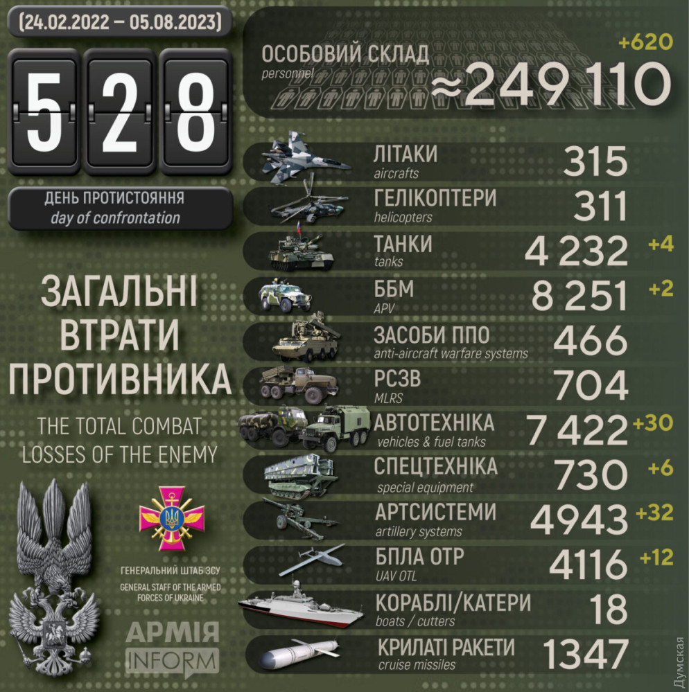 Силы обороны за сутки уничтожили 32 вражеские артсистемы, 12 дронов и более 600 оккупантовДвенадцать дронов, 32 артсистемы и 620 военных потеряли оккупанты в Украине за минувшие сутки. По данным Генерального штаба Вооруженных сил Украины, наши защитники также уничтожили 4 танка, 2 боевые бронированные машины, 30 единиц автомобильной техники и 6 - спецтехники. Общие боевые потери противника с 24.02.22 по 05.08.23 ориентировочно составляют: личного состава — 249110 (+620) человек ликвидировано танков — 4232 (+4) боевых бронированных машин — 8251 (+2) артиллерийских систем — 4943 (+32) РСЗО — 704 (0) средства ПВО - 466 (0) самолетов — 315 (0) вертолетов — 311 (0) БПЛА оперативно-тактического уровня — 4116 (+12), крылатые ракеты — 1347 (0) корабли / катера — 18 (0) автомобильной техники и автоцистерн — 7422 (+30) специальная техника — 730 (+6) СМЕРТЬ РОССИЙСКИМ ОККУПАНТАМ! Заметили ошибку? Выделяйте слова с ошибкой и нажимайте control-enter |