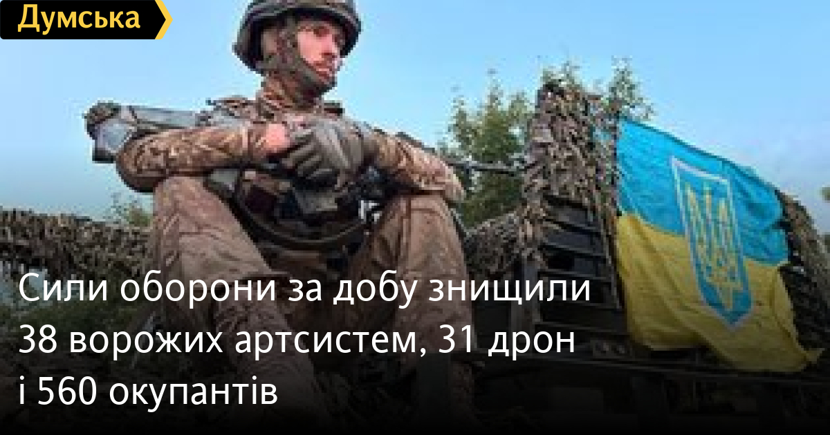 Сили оборони за добу знищили 38 ворожих артсистем, 31 дрон і 560 окупантівПонад 550 солдатів та офіцерів, 38 артилерійських систем і 31 дрон оперативно-тактичного рівня втратили окупанти в Україні за минулу добу. За даними Генерального штабу Збройних сил України, наші захисники також знищили 9 танків, 7 бойових броньованих машин, 6 реактивних систем залпового вогню, засіб ППО, 26 одиниць автомобільної техніки та 4 - спецтехніки. Загальні бойові втрати противника з 24.02.22 по 5.09.23 орієнтовно становлять: особового складу ‒ 265680 (+560) осіб ліквідовано танків ‒ 4489 (+9) бойових броньованих машин ‒ 8670 (+7) артилерійських систем ‒ 5649 (+38) РСЗВ ‒ 747 (+6) засоби ППО ‒ 504 (+1) літаків ‒ 315 (0) гелікоптерів ‒ 316 (0) БПЛА оперативно-тактичного рівня ‒ 4512 (+31) крилаті ракети ‒ 1447 (+0) кораблі / катери ‒ 19 (0) автомобільної техніки та автоцистерн ‒ 8175 (+26) спеціальна техніка ‒ 851 (+4) СМЕРТЬ РОСІЙСЬКИМ ОКУПАНТАМ! Помітили помилку? Виділяйте слова з помилкою та натискайте control-enter |