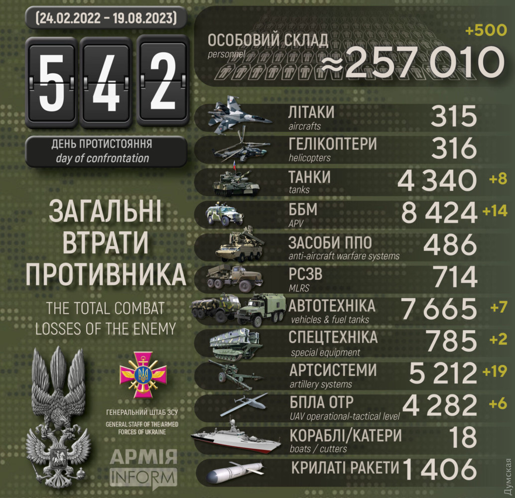 Сили оборони за добу знищили 8 танків, 19 артсистем і 500 окупантівВісім танків, 19 артсистем і 500 військових втратили окупанти в Україні за минулу добу. За даними Генерального штабу Збройних сил України, наші захисники також знищили 14 бойових броньованих машин, 6 дронів оперативно-тактичного рівня, 7 одиниць автомобільної техніки та 2 - спецтехніки. Загальні бойові втрати противника з 24.02.22 по 19.08.23 орієнтовно становлять: особового складу ‒ 257010 (+500) осіб ліквідовано танків ‒ 4340 (+8) бойових броньованих машин ‒ 8424 (+14) артилерійських систем ‒ 5212 (+19) РСЗВ ‒ 714 (0) засоби ППО ‒ 486 (0) літаків ‒ 315 (0) гелікоптерів ‒ 316 (0) БПЛА оперативно-тактичного рівня ‒ 4282 (+6) крилаті ракети ‒ 1406 (0) кораблі / катери ‒ 18 (0) автомобільної техніки та автоцистерн ‒ 7665 (+7) спеціальна техніка ‒ 785 (+2) СМЕРТЬ РОСІЙСЬКИМ ОКУПАНТАМ! Помітили помилку? Виділяйте слова з помилкою та натискайте control-enter |