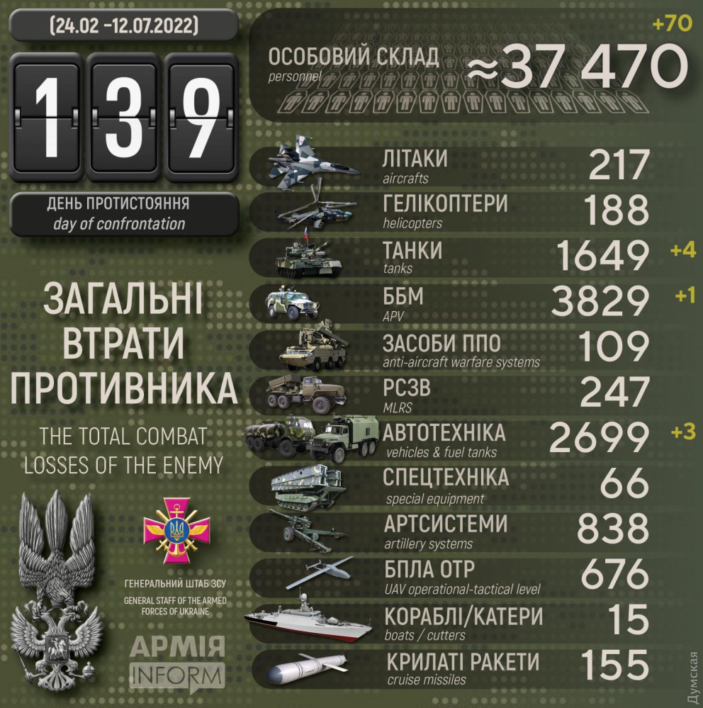Загальні бойові втрати противника з 24.02 по 12.07 орієнтовно склали:
