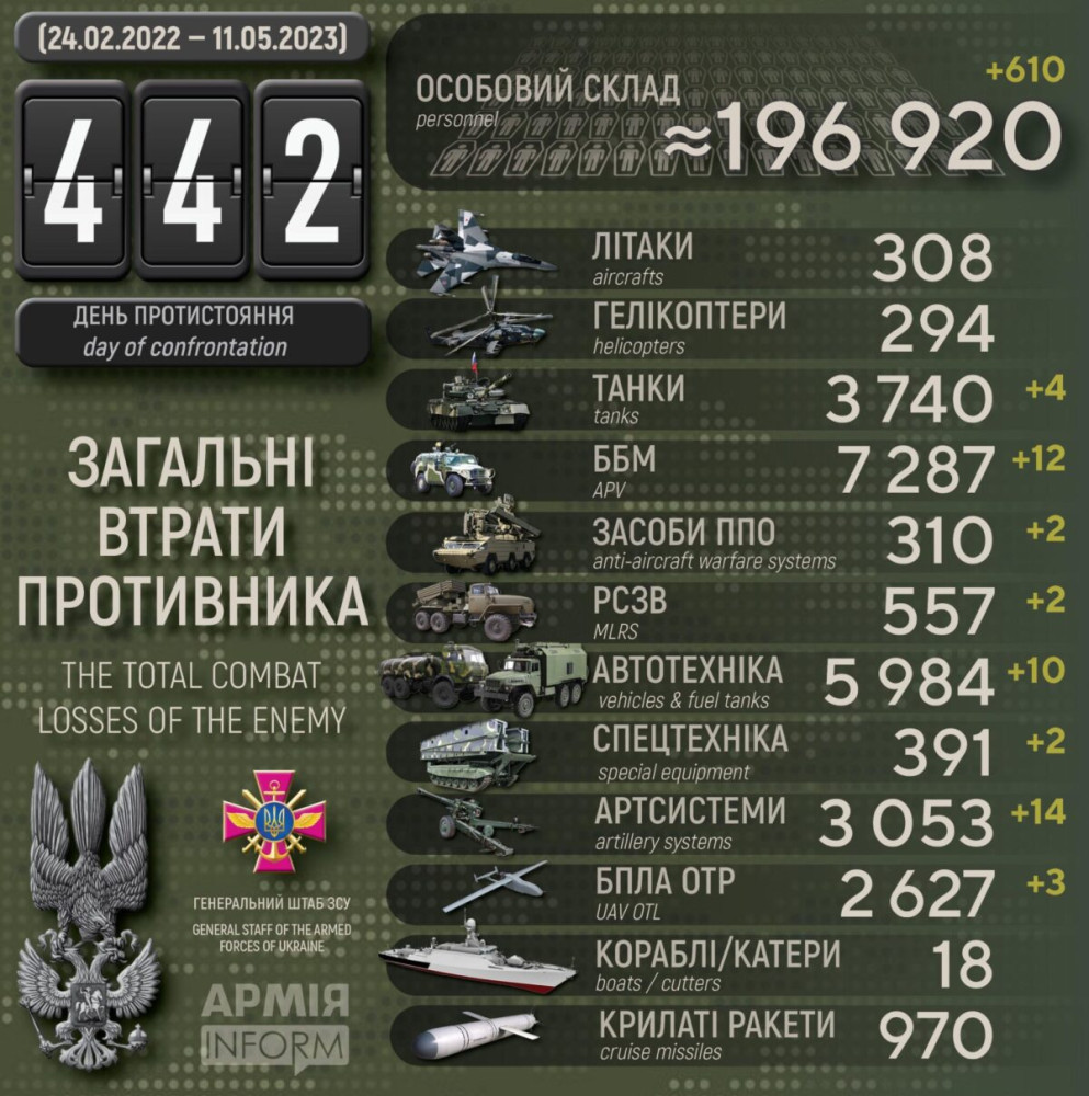 Сили оборони за добу знищили дванадцять ворожих бойових бронемашин, 14 артсистем і понад 600 окупантівДванадцять ворожих бойових бронемашин, 14 артсистем, вісім артсистем і 610 військових втратили окупанти в Україні за минулу добу. Крім того, за даними Генерального штабу Збройних сил України, наші захисники також знищили чотири танки, дві РСЗВ і стільки ж засобів ППО, три дрони оперативно-тактичного рівня, десять одиниць автомобільної техніки і дві - спецтехніки. Усього з початку повномасштабного вторгнення втрати ворога склали: особового складу ‒ 196920 (+610) осіб ліквідовано танків ‒ 3740 (+4) бойових броньованих машин ‒ 7287 (+12) артилерійських систем ‒ 3053 (+14) РСЗВ ‒ 557 (+2) засоби ППО ‒ 310 (+2) літаків ‒ 308 (0) гелікоптерів ‒ 294 (0) БПЛА оперативно-тактичного рівня ‒ 2627 (+3) крилаті ракети ‒ 970 (0) кораблі / катери ‒ 18 (0) автомобільної техніки та автоцистерн ‒ 5984 (+10) спеціальна техніка ‒ 391 (+2) СМЕРТЬ РОСІЙСЬКИМ ОКУПАНТАМ! Помітили помилку? Виділяйте слова з помилкою та натискайте control-enter |