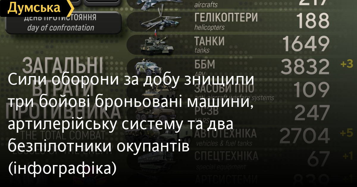 Три бойові броньовані машини, артилерійську систему та два безпілотники оперативно-тактичного рівня втратили загарбники минулої доби в Україні.