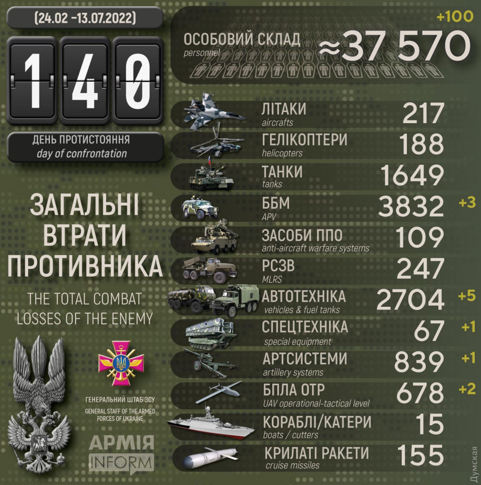 Загальні бойові втрати противника з 24.02 по 13.07 орієнтовно склали: