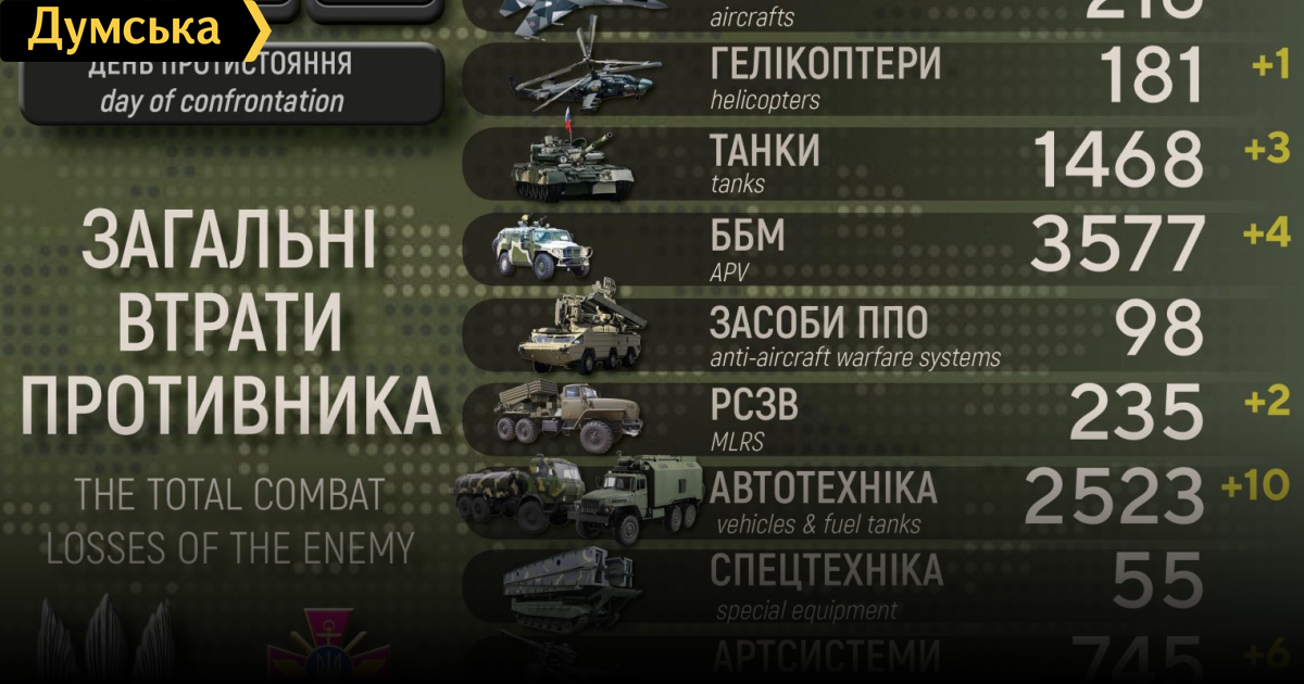 Сили оборони за добу знищили ворожий гелікоптер, три танки та шість артилерійських системГелікоптер, три танки та шість артилерійських систем втратили окупанти минулої доби в Україні. Убито або в полоні 250 російських нацистів. Крім того, як повідомляють у Генштабі Збройних сил, українські захисники знищили чотири бойові броньовані машини, дві реактивні системи залпового вогню, десять авто або цистерн, чотири безпілотники та одну крилату ракету. Загальні бойові втрати противника з 24.02 по 19.06 орієнтовно склали: особового складу – близько 33600 (+250) осіб, танків ‒ 1468 (+3), бойових броньованих машин ‒ 3577 (+4), артилерійських систем – 745 (+6), РСЗВ – 235 (+2), засоби ППО – 98, літаків – 216, гелікоптерів – 181 (+1), БПЛА оперативно-тактичного рівня – 598 (+4), крилаті ракети – 130 (+1), кораблі /катери – 14 (+0), автомобільної техніки та автоцистерн – 2523 (+10), спеціальна техніка – 55. Найбільших втрат противник зазнав на бахмутському та запорізькому напрямках. Дані уточнюються. СМЕРТЬ РОСІЙСЬКИМ ОКУПАНТАМ! Помітили помилку? Виділяйте слова з помилкою та натискайте control-enter |