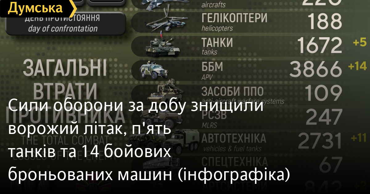 Літак, п'ять танків та 14 бойових броньованих машин втратили загарбники минулої доби в Україні.
